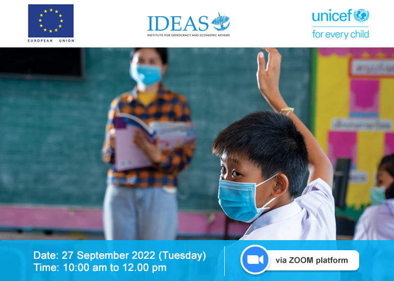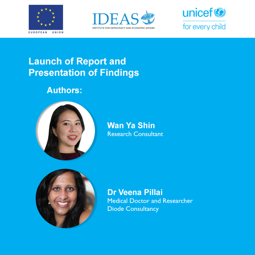 More than 25% of the refugees and asylum-seekers registered with the United Nations High Commissioner for Refugees (UNHCR) in Malaysia are children below the age of 18. This means that some 47,200 children have limited or no access to education, healthcare and other essential services due to their lack of legal status. The lack of a domestic legislative and administrative framework to protect refugees and asylum seekers in Malaysia puts these children amongst the most vulnerable groups in society to the impact of COVID-19 (figures as of the end of June 2022).This webinar will present the report launch of “Left Far Behind: The Impact of COVID-19 on Access to Education and Healthcare for Refugee and Asylum-Seeking Children in Peninsular Malaysia” – a study conducted under Protecting children affected by migration in Southeast, South and Central Asia, a project implemented by UNICEF and IDEAS, and co-funded by the European Union and UNICEF. This report presents the assessment of the impacts of COVID-19 on refugee and asylum-seeking children’s access to education and healthcare in Malaysia as well as evidence-based solutions to address them. Our webinar panel serves as a platform for IDEAS and UNICEF to present the report to relevant government ministries, members of parliament, international organisations, academics, activists, NGOs and the general public.Launch report: