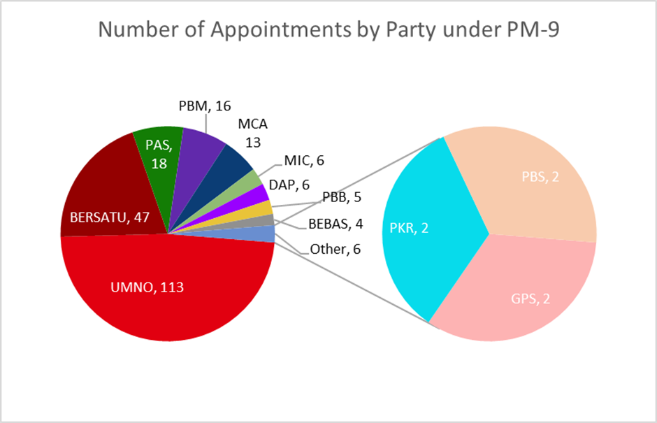 The data monitored between August 2021 until September 2022 shows that there has been a worrying increase in the number of political appointments for FSBs under the ninth Prime Minister. Overall, there were 234 appointments made with 115 of those retained from the previous administration while as many as 119 new entries were identified. UMNO dominated for the number of politicians retained in FSBs with 52 appointments while BERSATU had 28 appointments and PAS had 11 appointments. Furthermore, more than half of the brand new appointments belong to UMNO (61), followed by BERSATU (19), the newly established PBM (15), PAS (7) and MCA (5).