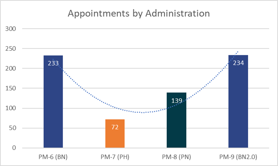 “The findings from our Pantau Kuasa see a sharp increase in political appointments from Tan Sri Muhyiddin Yassin’s administration to Dato’ Sri Ismail Sabri’s administration. These are some measurable indicators of the possible political compromises made to accomodate the various parties’ interests within a coalition and to maintain political stability at the federal government level. Having too many political figures within FSBs as the nation transitions and recovers from the devastating COVID-19 period brings into question the due diligence aspect of these appointment processes,” commented Dr Tricia Yeoh, CEO of IDEAS.
