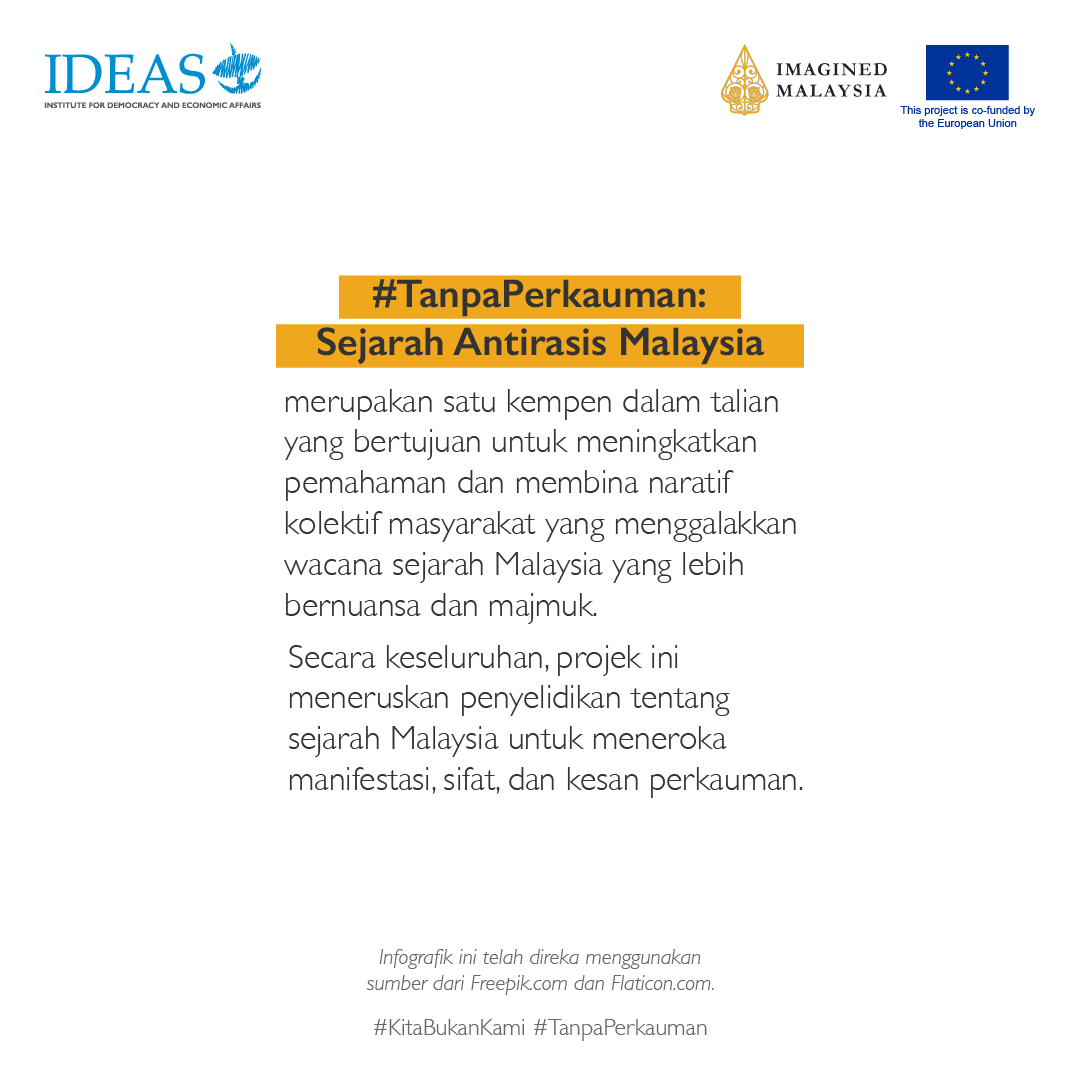 Kami bersama @imaginedmalaysia sedang bekerjasama untuk Projek #TanpaPerkauman: Sejarah Antirasis Malaysia, sebuah kempen yang bertujuan untuk memperkukuh kualiti wacana sejarah Malaysia supaya lebih inklusif, tepat dan majmuk. Projek ini dibiayai bersama oleh @euinmalaysia.