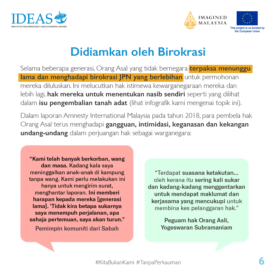 Pelbagai halangan perundangan dihadapi oleh Orang Asal. Hal ini bukan berkenaan pengiktirafan terhadap hak tanah adat semata-mata. Malah, kewarganegaraan tanpa pengiktirafan adalah masalah utama yang merugikan kepada perjuangan mendapatkan hak pribumi.