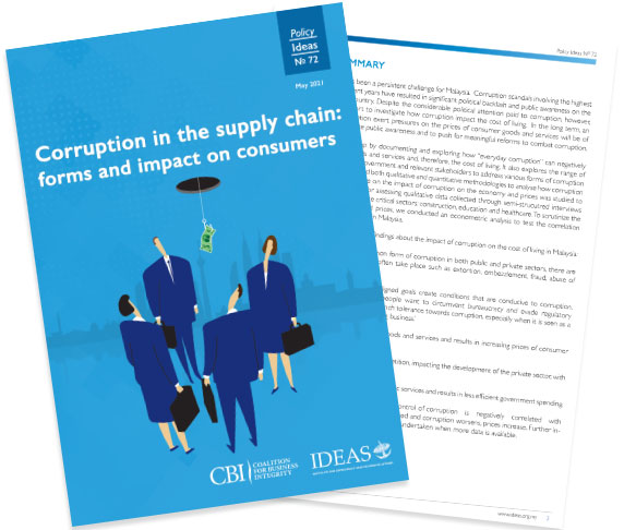 This paper aims to fulfil that gap by documenting and exploring how “everyday corruption” can negatively impact prices of consumer goods and services and, therefore, the cost of living. It also explores the range of actions that can be taken by the government and relevant stakeholders to address various forms of corruption that will affect the prices. IDEAS utilized both qualitative and quantitative methodologies to analyze how corruption can impact prices. Existing literature on the impact of corruption on the economy and prices was studied to develop a conceptual framework for assessing qualitative data collected through semi-structured interviews with private sector operators in three critical sectors: construction, education and healthcare. To scrutinize the relationship between corruption and prices, we conducted an econometric analysis to test the correlation between corruption and price levels in Malaysia.