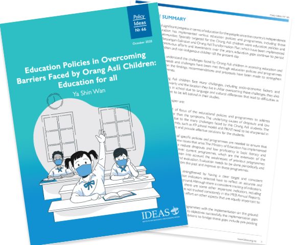 This policy paper aims to understand the challenges faced by Orang Asli children in accessing education and to analyze if their unique needs and challenges have been met through education policies and programmes designed for them. Based on the findings, recommendations and proposals have been made to strengthen existing policies and programmes.