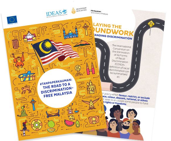 A collaboration betweeen IDEAS and Imagined Malaysia which serves to offer a concise compilation of the #TanpaPerkauman infographics under the National Unity and Interracial Harmony project funded by the European Union (EU). This handbook functions also as an educational resource and visual aid to inform and create greater awareness among the public regarding race relations, human rights, and the significance of international conventions for Malaysia from a historical-social perspective.