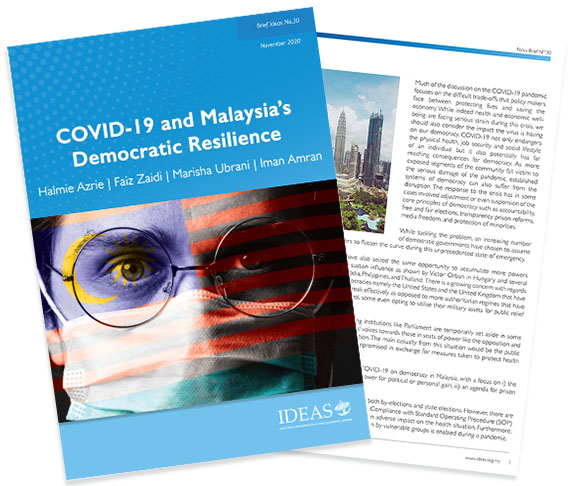This Brief IDEAS argues that Malaysia’s democratic institutions have been tested in various ways ever since the pandemic struck in March this year. The paper highlights that election-management will need to be improved, Parliamentary proceedings have been compromised, federal-state government relations and coordination have worsened and the lack of transparency and accountability in procurement and financial disclosure has undermined confidence in the response to the crisis.