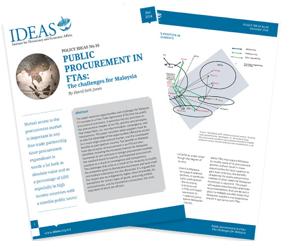 The paper examines opportunities and challenges for Malaysia if it accedes to a Free Trade Agreement (FTA) that has public procurement provisions. It examines the key provisions in the procurement chapter of an FTA, and the core principles that shape them, viz. non-discrimination, convergence, and transparency. The paper considers what suppliers must do to take full advantage of the opportunities offered by access to a much larger procurement market, and the consequent benefits to each partner country.