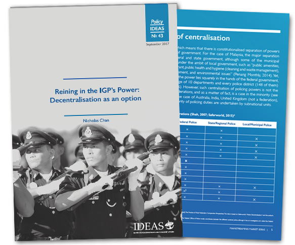 This paper examines decentralisation as a potential policy option for the Malaysian Inspector General of Police’s (IGP) office given the issues of accountability and overcentralisation. It is a continuation of a previous IDEAS policy paper (Strengthening the Royal Malaysia Police by Enhancing Accountability) that discusses the failure of oversight bodies in enhancing the accountability of the IGP’s office due to the lack of greater structural reforms.
