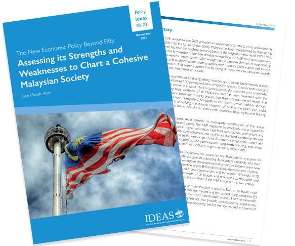 The New Economic Policy’s 50th anniversary in 2021 provides an opportunity to reflect on its achievements and shortfalls, and imagine boldly into the future. Undoubtedly, Malaysia has been transformed by the NEP at all levels and aspects. The debates surrounding the NEP tend to be polarising and often reach a stalemate; however, a more constructive engagement is possible through re-appreciating the NEP’s strengths and examining its weaknesses/omissions, grappling with its policy discourses as well as with its popular but misguided perspectives. This paper suggests that by doing all these, we can ultimately recraft the NEP to forge a cohesive and inclusive Malaysian society.