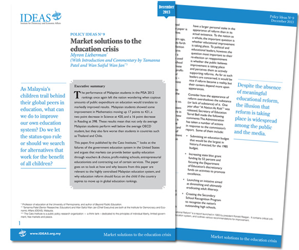 This paper, first published by the Cato Institute, looks at the failures of the government education system in the United States and argues that markets can provide better quality education through vouchers & choice, profit-making schools, entrepreneurial educationists and contracting out of certain services. The paper goes on to look at how and why lessons from this paper are relevant to the highly centralised Malaysian education system, and why education reform should focus on the child if the country aspires to move up in global education rankings.