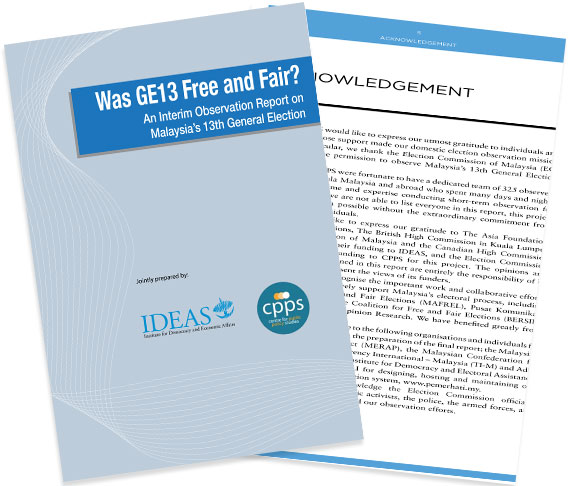 IDEAS was accredited by Malaysia’s Election Commission (EC) to independently observe the country’s recent general election. I am pleased to send you the report that we produced at the conclusion of our observation mission.Our mandate was to observe, record, and report events leading up to GE13, and recommend ways to improve any weaknesses found. We deployed 325 observers to 99 out of the 222 parliamentary constituencies plus 6 overseas polling centres.