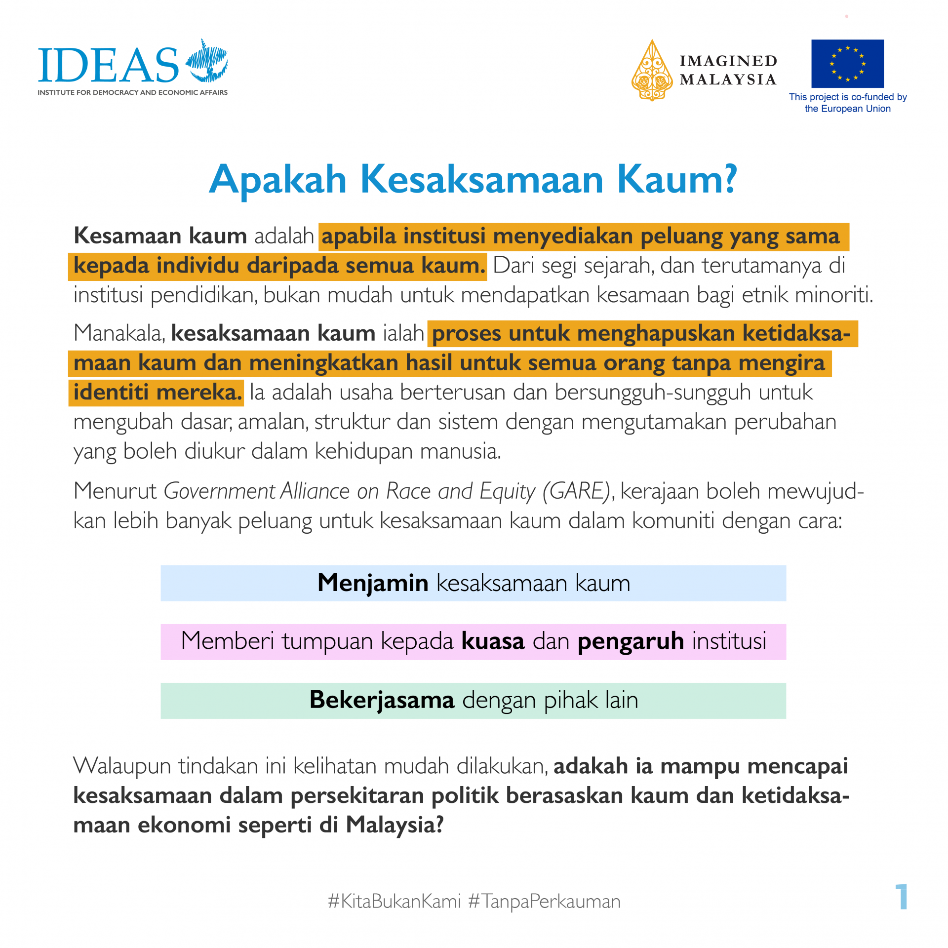 Sejak tahun 1957, pemimpin negara telah mengulangi komitmen mereka untuk sedaya upaya mencapai kesamaan dalam masyarakat Malaysia yang berbilang kaum. Sejauh manakah pendirian ini benar? Bagaimanakah kerajaan Malaysia menunjukkan komitmennya bukan sahaja kepada rakyat, bahkan kepada dunia?